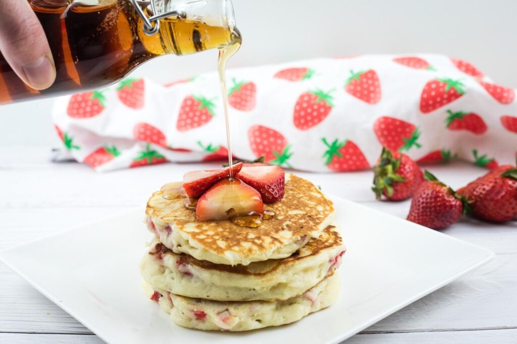 Serve your Strawberry Pancakes with butter, maple syrup, and extra sliced strawberries for an easy breakfast everyone will love. They are also great with scrambled eggs, Grandma’s Baked Western Omelet, bacon, or breakfast sausage if you want a fuller brunch spread. For a fun finish, add a dollop of whipped cream or a spoonful of strawberry jam on top.